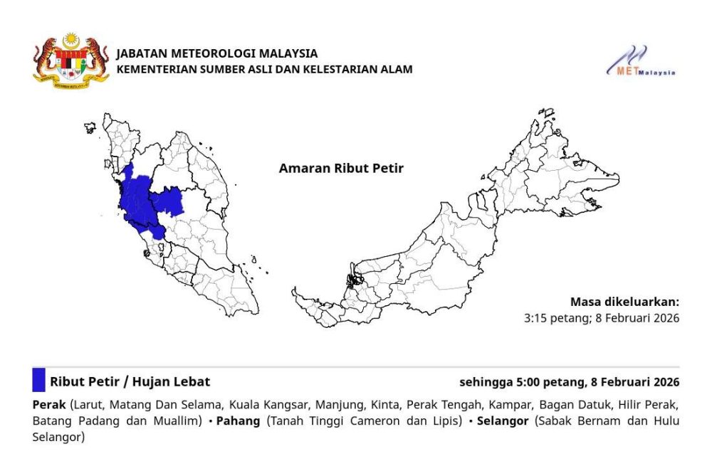 气象局于今日下午3时15分紧急发布雷雨警报,北马、中马及东海岸部分地区正笼罩在狂风暴雨的威胁之下。根据最新预报,霹雳、彭亨及雪兰莪多地将出现强降雨,恶劣天气预计将持续至傍晚5时,民众受促提高警惕。