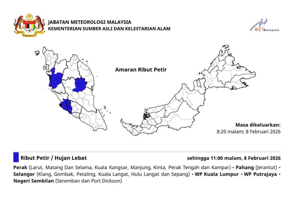 马来西亚气象局紧急更新雷雨警报:狂风暴雨的威胁并未消散,反而进一步扩大!根据当局在今晚8时20分发布的最新公告,西马多州包括霹雳、彭亨、雪隆及森美兰等地区的恶劣天气将持续升级,预计强降雨将狂炸至今日(2月8日)深夜11时。
