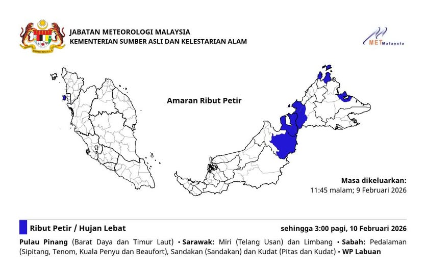 根据气象局于今晚11时45分发布的最新气象预测,北马槟岛(东北及西南县)、纳闽联邦直辖区,以及东马砂沙多地将面临雷雨及大风侵袭。在砂拉越方面,受影响地区包括美里(特朗乌山)及林梦;沙巴受影响范围则涵盖内陆地区(实必丹、丹南、瓜拉班尤及保佛)、山打根以及古达(必达士及古达)。