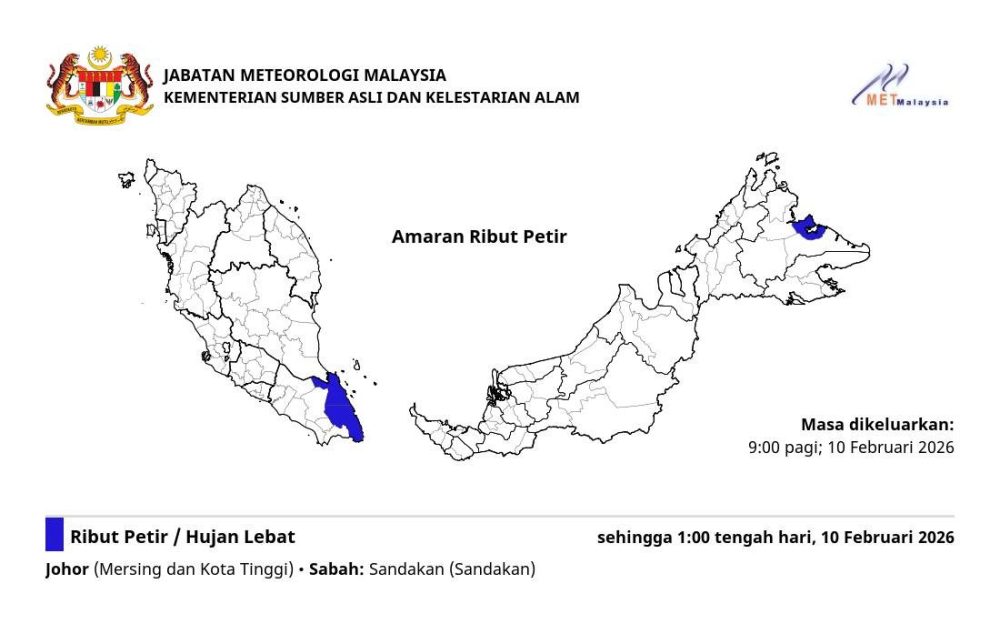 气象局于今早9时发出紧急气象预警,柔佛州及沙巴部分地区预计将迎来雷雨及强降雨,恶劣天气料持续至今日(10日)中午1时为止。