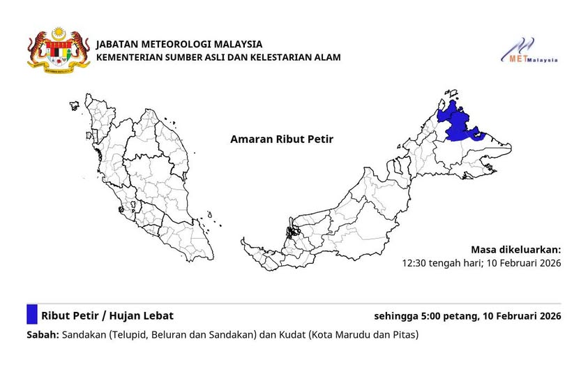 根据气象局发布的最新消息,雷雨预警范围涵盖沙巴北部与东海岸,受影响地区如下: