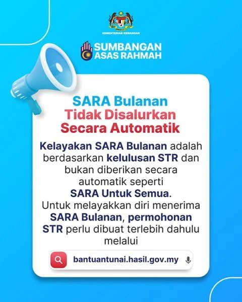 想要每个月领到“关爱基本援助金”(SARA Bulanan)?别以为这笔钱会自动汇入户口!财政部今日特别在社交媒体发布贴文,向民众发出一项重要提醒:SARA 援助金并非独立或自动发放的项目,它的先决条件是申请者必须先成功通过“关爱援助金”(STR)的审核。