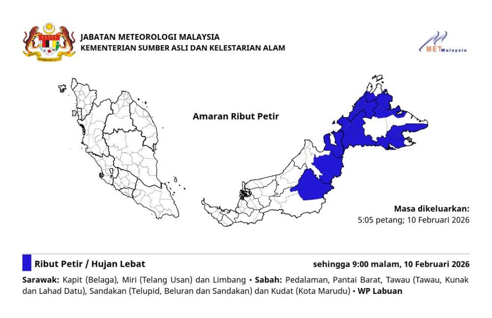 根据气象通告,砂拉越的加帛(布拉甲)、美里(特朗乌山)及林梦首当其冲;沙巴方面,受影响区域包括内陆地区、西海岸、斗湖(斗湖、古纳及拿笃)、山打根(特鲁必、比鲁兰及山打根)以及古达(哥打马鲁都)。此外,纳闽联邦直辖区同样也在雷雨警报的笼罩之下。