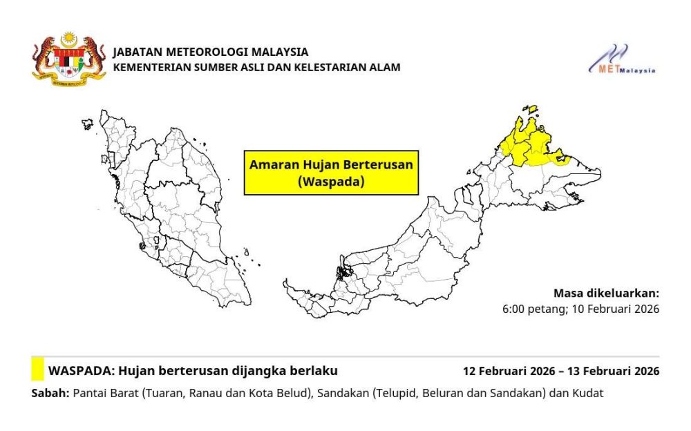 沙巴州民请注意,气象局今日傍晚正式发布“持续降雨警报(黄色警戒)”!从本周四(12日)起至周五(13日),沙巴多个地区预计将迎来连绵不断的豪雨,民众受促提前做好防灾准备,严防闪电水灾与土崩发生。