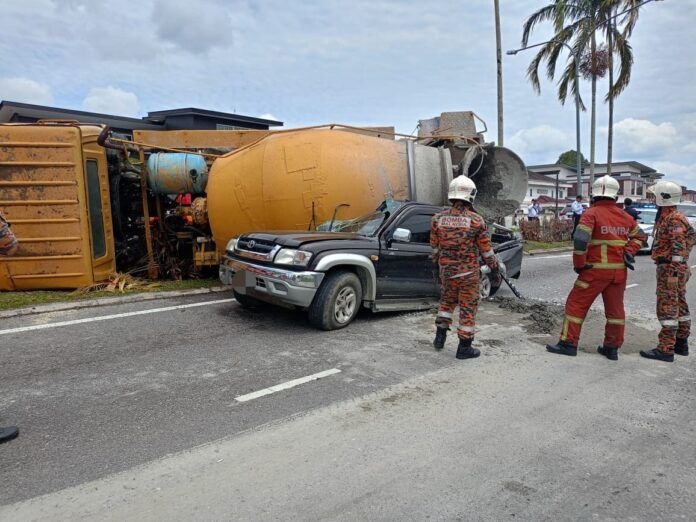 德圣路发生夺命车祸,一辆失控翻覆的搅洋灰车从后“泰山压顶”,正巧砸中前方皮卡车的司机驾驶座,导致年约60岁的华裔男司机陈氏当场魂断公路。