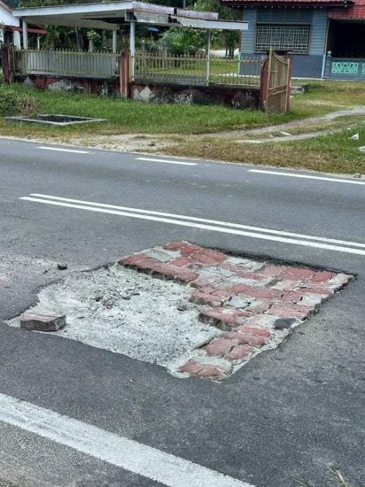 事主今日通过脸书发文,心有余悸地揭发该路段的危险情况。他指出,有关当局疑是采用“补丁”式维修,仅用砖块填盖路面坑洞,结果砖块在车辆碾压下轻易脱落,形成极具杀伤力的深坑,对路过的公路使用者,尤其是“皮包铁”的摩托车族构成严重的夺命威胁。