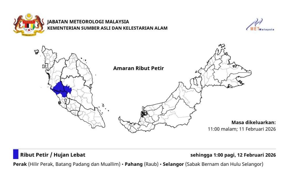 夜猫子请注意,狂风暴雨正在袭来!大马气象局在今深夜11时发布紧急气象预警,西马半岛多个地区预计将迎来强雷雨及大风天气,恶劣气候将一路肆虐至明日(12日)凌晨1时。