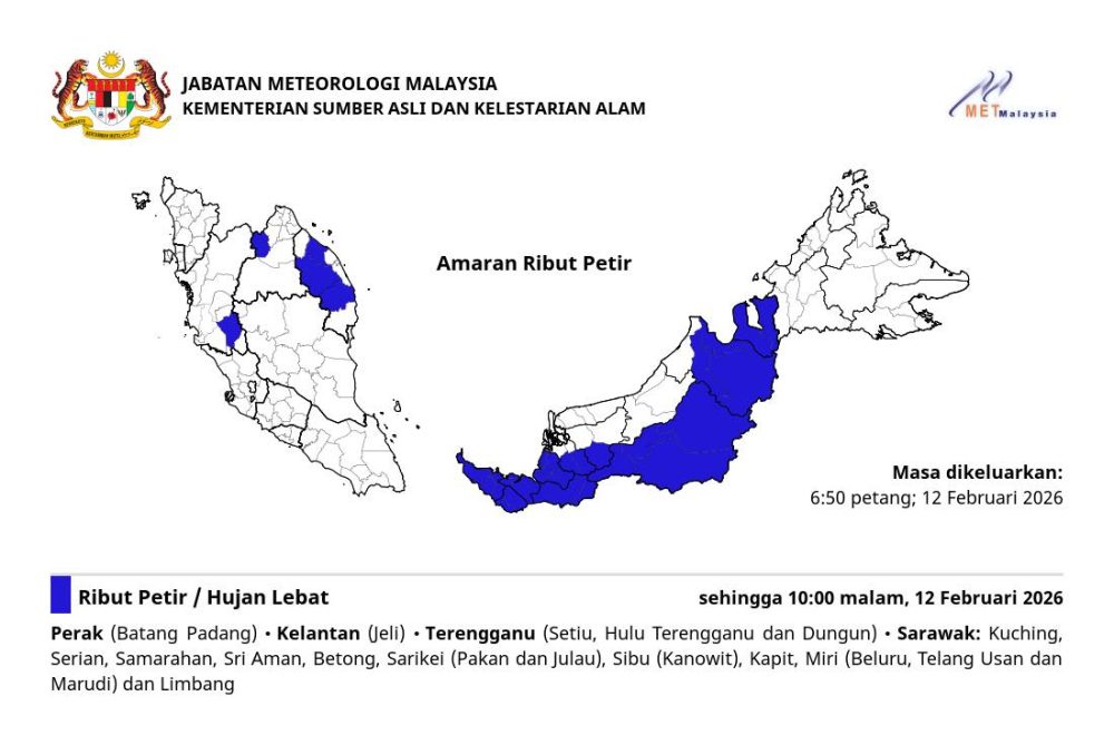 根据气象局于2月12日傍晚6时50分发布的通告,多个州属局部地区预计将出现雷雨及豪雨情况,警报生效至今晚10时。
