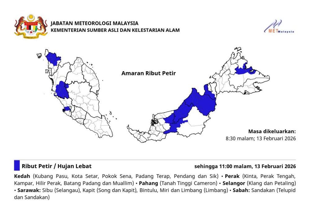 根据大马气象局于2026年2月13日晚上8时30分发布的最新预警,国内多个州属及地区将迎来雷雨及强降雨天气,预计恶劣气候将持续至今日深夜11时。