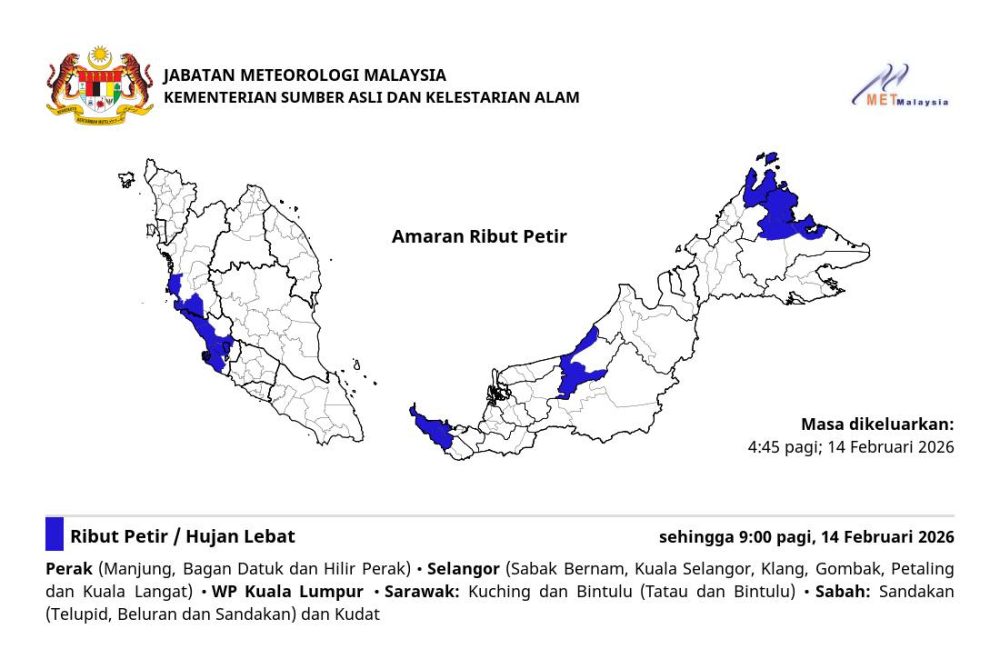 马来西亚气象局于今日(14日)清晨4时45分发布最新的气象预警,预料国内多个州属及直辖区将迎来强风雷雨天气,相关警告有效期将持续至今日上午9时。