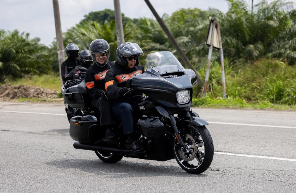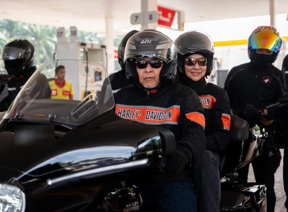 阿末扎希随后在面子书大方分享其行程动态。画面中,他褪下严肃的官服,换上飒爽的骑行装,与夫人拿汀斯里哈米达共乘一辆重型摩哆从住家出发。这趟回乡路也充满了人情味,夫妻俩中途还特意停靠在直落坡(Teluk Panglima Garang),出席友人孩子的婚礼送上诚挚祝福,随后才顶着风尘继续南下。