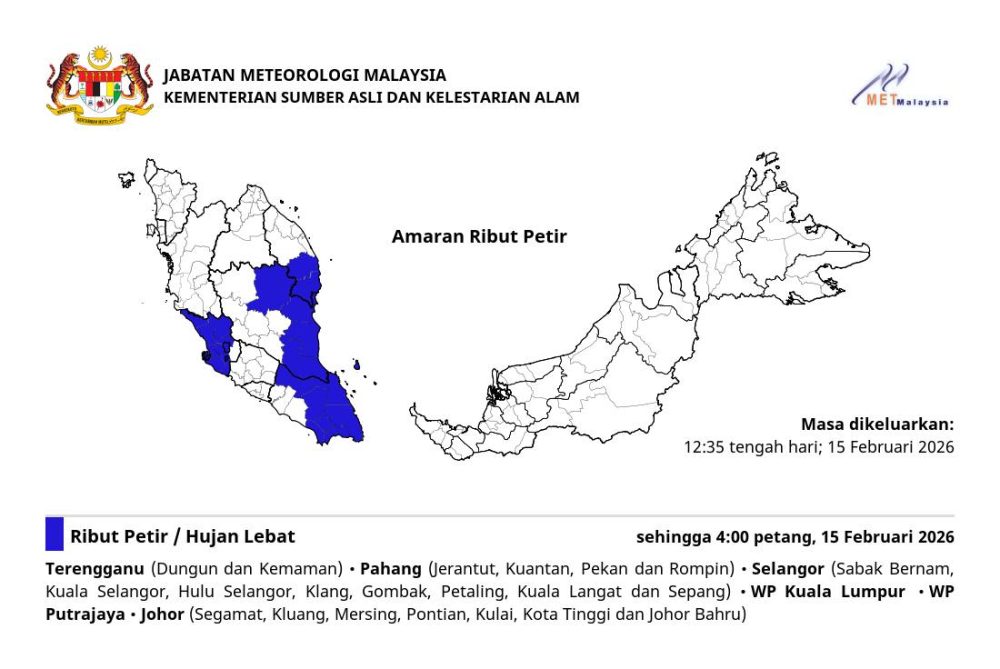 根据马来西亚气象局(MET Malaysia)于2026年2月15日发布的最新预警,西马多个地区将迎来雷雨及强降雨,预警有效时间持续至今日下午4时。