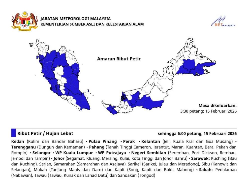 全马多州陷入“雨神”包围圈!大马气象局在今日下午3时30分发布紧急气象预警,全国多个地区正面临强雷雨、暴雨及狂风侵袭,恶劣天气预计将持续狂飙至今日(2月15日)傍晚6时。