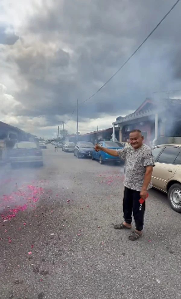 她透露,那位马来邻居大叔甚至特地走到鞭炮旁边,请她帮忙拍照留念,笑得十分灿烂。