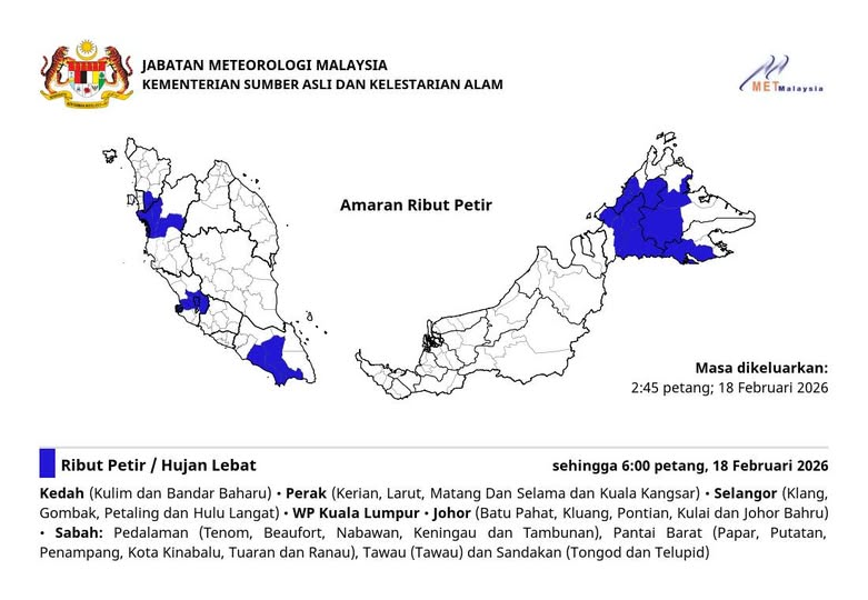 气象局于今日(18日)下午2时45分发布紧急气象预报,全马多州正笼罩在强烈的对流天气下。受影响地区将迎来猛烈雷阵雨,伴随而来的强风和每小时超过20毫米的豪雨,预计将持续至今午6时。
