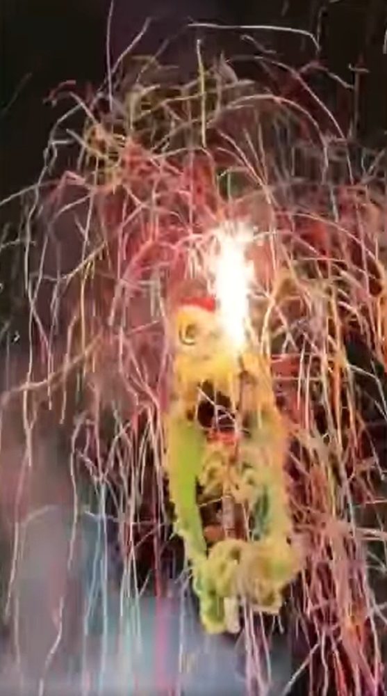 据了解,事发时正进行户外舞狮演出,观众向高桩方向喷射五彩纸屑助兴,同时场地周边配合燃放烟花以营造节庆气氛。画面显示,纸屑附着在狮服表层后,与烟花火源距离较近,最终引发险情。