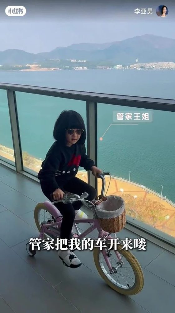 影片中,李亚男以一身名媛姿态带观众领略她的“港式精致日常”。她首先在装潢气派的超大衣帽间挑选行头,不仅展示了琳琅满目的名牌收藏,随后更移步到宽敞得惊人的露台享受日光浴。这个露台不仅能将无敌海景尽收眼底,空间更是大到离谱,除了能安放一张悠闲吊椅,甚至还能让女儿在上面骑脚踏车“飞驰”,宛如私人运动场。