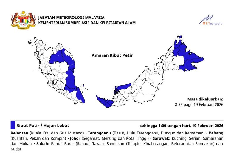 大马多个地区预计将迎来狂风暴雨,局部地区甚至会出现雷雨交加的恶劣天气。根据官方发布的最新气象报告,受影响范围横跨西马东海岸、柔佛以及东马砂沙两州,预计这波风雨将持续至今午(19日)1时。