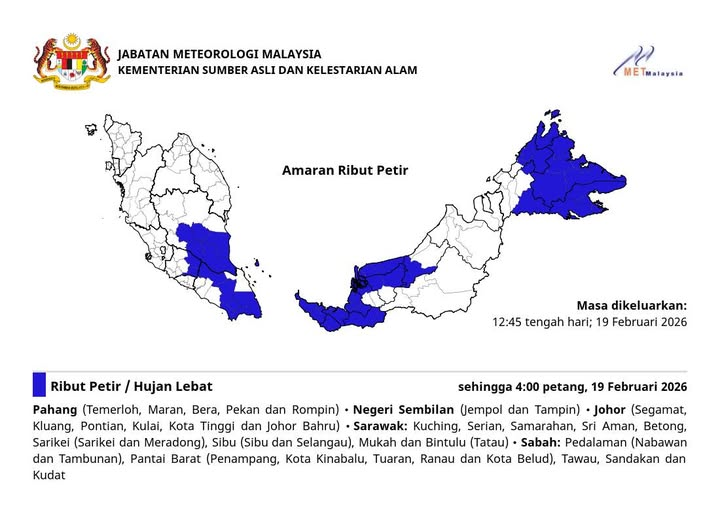 气象局发出紧急预警,我国多个地区预计将迎来强风暴雨!根据大马气象局在今日(2月19日)中午12时45分发布的最新气象通知,半岛三州、砂拉越及沙巴多个县市将受雷阵雨袭击,恶劣天气预计持续至下午4时。