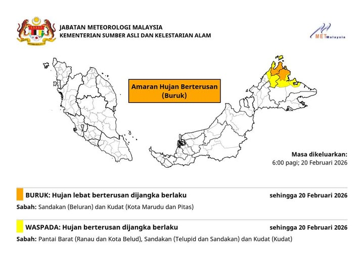 大马气象局于今日(20日)清晨6时发布最新雨势预警,由于季候风云团持续滞留,沙巴北端与东海岸多地将迎来持续不断的强降雨,其中部分地区已提升至“严重”级别,预计恶劣天气将笼罩全日。