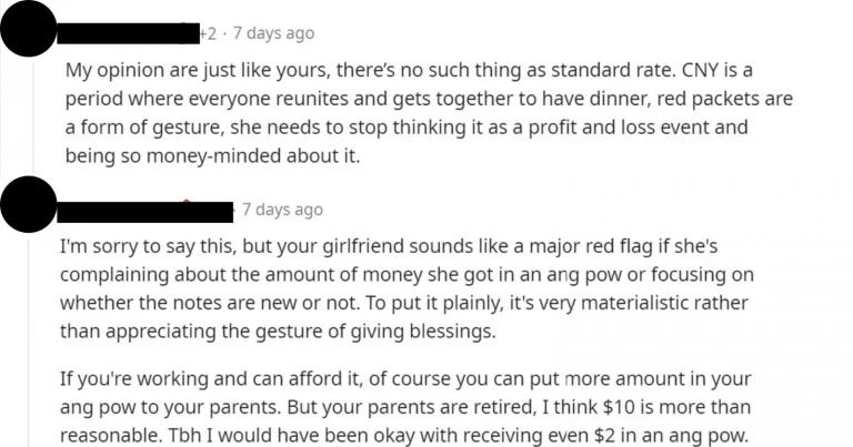 根据早前在新加坡论坛《r/askSingapore》疯传的帖文显示,这对跨国情侣趁着春节回到男方位于新山的甘榜家乡。男方母亲大方给在场每位后辈都封了10新元的红包,原以为是长辈的一份心意,没料到女友不仅不领情,私下还向男友疯狂抱怨。她直指这是自己收过“数额最小”的红包,并开启对比模式,大赞自己在新加坡的亲戚出手更阔绰,甚至对钞票的“新旧程度”也颇有微词。