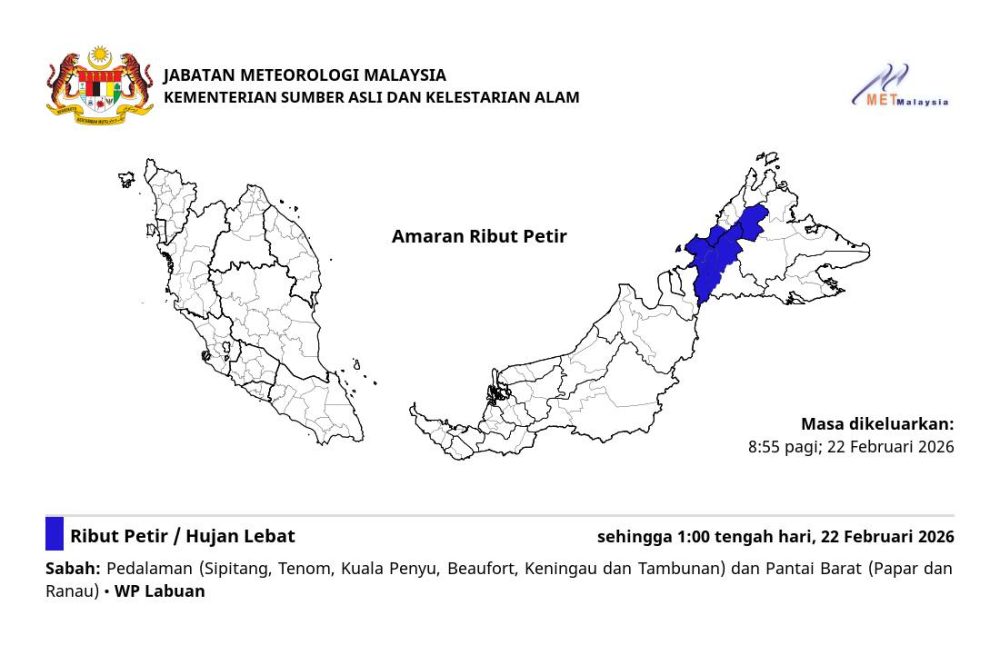 根据气象局资讯,警报于今早8时55分发布,有效至今日下午1时。受影响地区包括沙巴内陆(Pedalaman)多个县区,即Sipitang、Tenom、Kuala Penyu、Beaufort、Keningau及Tambunan,以及西海岸(Pantai Barat)的Papar与Ranau;联邦直辖区纳闽(WP Labuan)同样列入警报范围。