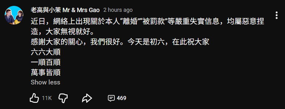 据台媒报道,老高在发文中点名近期网络流传的“离婚”“被罚款”等传言,强调均属严重失实、刻意编造。对于外界长期关注的婚姻状况,他也以简短一句话回应:“谢谢大家关心,我们很好。”相关表态被解读为直接否认婚变传闻,并试图为持续发酵的谣言降温。