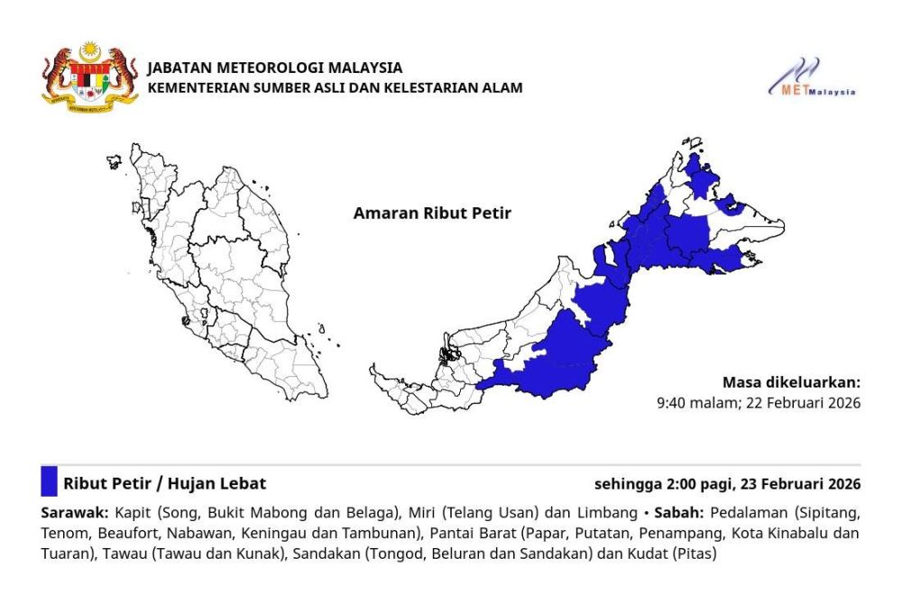 气象局发布最新警报,雷雨、暴雨及强风将横扫东马多个地区!根据马来西亚气象局(MET Malaysia)于周日(22日)晚上9时40分发出的预警,沙巴与砂拉越受影响地区的恶劣天气预计将持续至周一(23日)凌晨2时。