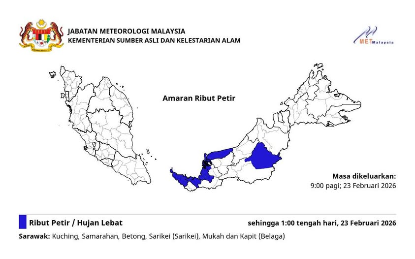 砂拉越子民注意,出门记得带伞!大马气象局今早发出气象预警,砂州境内多个地区预计将迎来狂风暴雨,恶劣天气将持续至今日下午1时。