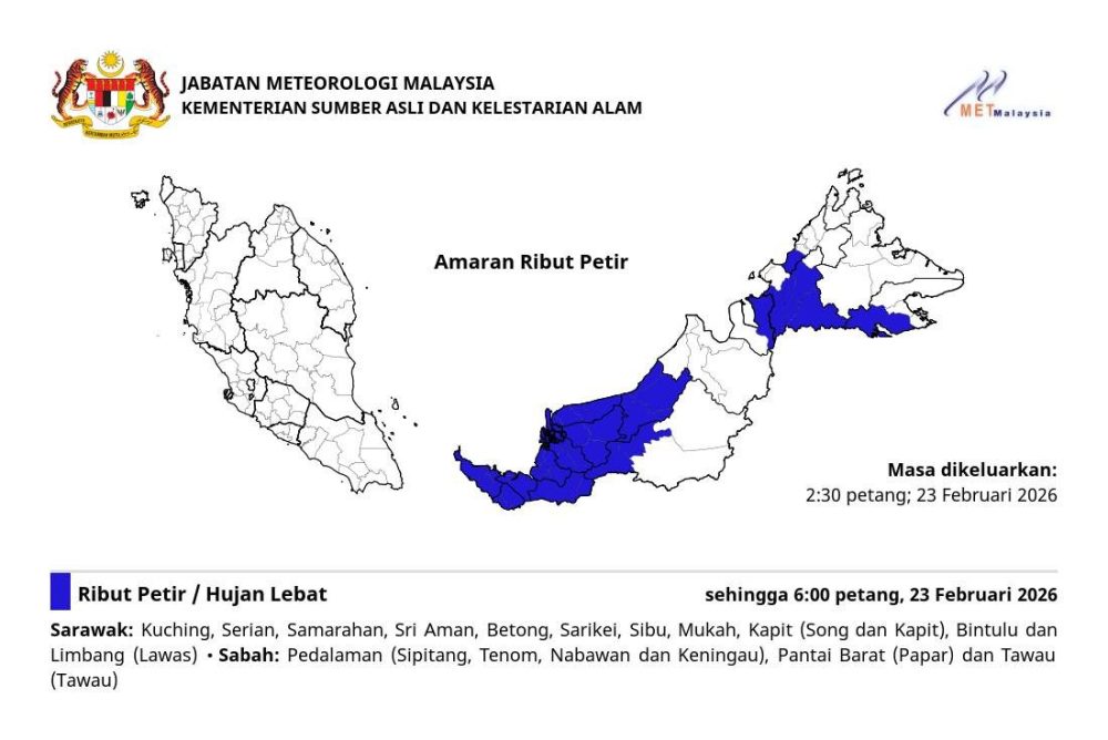 与此同时,沙巴州也无法幸免。气象局点名沙巴内陆地区(实必丹、丹南、纳巴湾、根地咬)、西海岸的吧巴,以及斗湖(斗湖市)同样将受暴雨侵袭。官方强调,此类雷雨警告属于短期预警,一旦监测到降雨强度持续超过一小时,便会立即发布。民众受促在风暴期间尽量留在室内,避免前往低洼地区或在强风下逗留,以防意外发生。