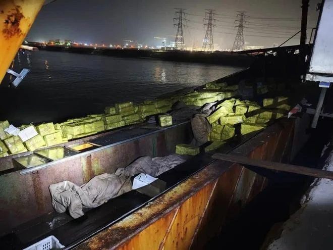 这起案件的破获堪称一场精彩的科技心理战。烟台海警并非盲目巡逻,而是预先透过“海洋智能态势感知系统”进行大数据分析,精准锁定了涉案船舶的航行轨迹。在全面掌握对方打算趁夜上岸卸货的“黄金时机”后,海警联手警方及边检部门埋伏就位。当悬挂着“粤某渔XX号”招牌的散货船靠岸的那一刻,伏击队员迅速封锁码头海陆出口,上演了一场教科书式的包抄。