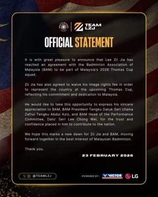 大马羽坛再传重磅喜讯!一度因肖像权争议引发僵局的“李梓嘉征战汤杯”风波,今晚终于迎来大团圆结局。大马羽球男单自由人李梓嘉团队正式发布文告宣布,已与大马羽总(BAM)达成共识,李梓嘉不仅确定披上国字号战袍出征今年的汤姆斯杯,更霸气宣布放弃肖像权费用,以实际行动粉碎“只认钱不爱国”的流言蜚语!