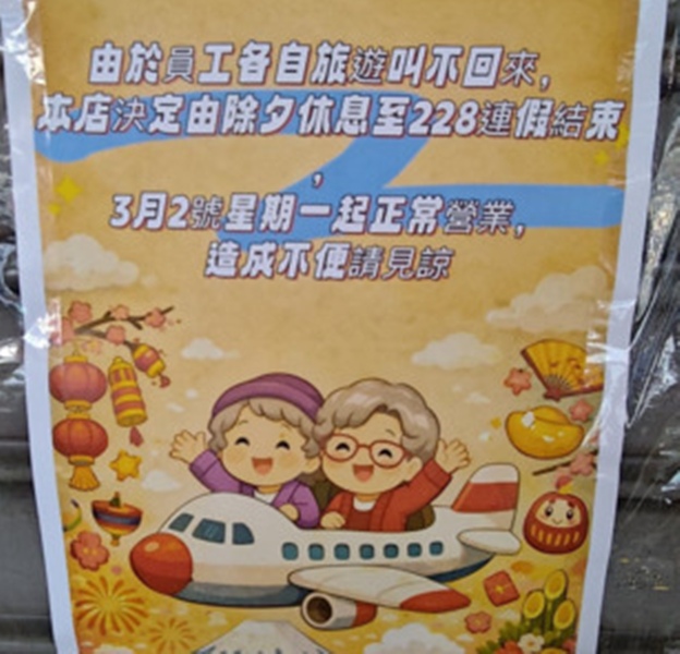 昨日(23日)本该是马年首个开工日,但有网民在脸书社团“路上观察学院”分享了一张令人目瞪口呆的停业告示。只见告示牌上赫然写着:“由于员工各自旅游叫不回来,本店决定由除夕休息至228连假结束,3月2号星期一正常营业,造成不便请见谅。”