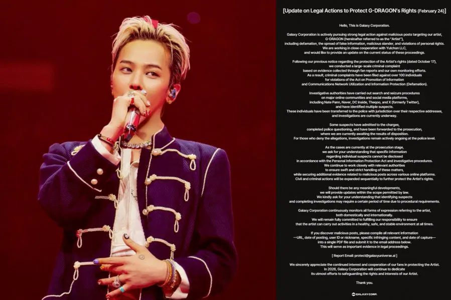 韩流天王 G-DRAGON(权志龙) 正式对网络恶意攻击展开强硬反击!所属经纪公司 Galaxy Corporation 今日发表声明,确认已对 超过100名恶意发文者提起刑事诉讼,其中部分嫌疑人已承认相关行为,并移送检察机关处理。