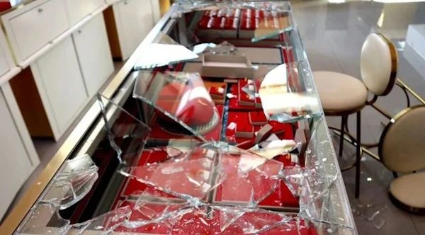 这起恶性盗窃案是于近日清晨被揭发。当地某金店店员准备开门营业时,惊觉原本锁好的卷闸门竟被离奇拉起,进店一看更是吓出一身冷汗——店内多个玻璃柜台被砸得粉碎,原本金灿灿的柜位已是一片狼藉,总计1000余件、重达3055.02克的黄金首饰不翼而飞。