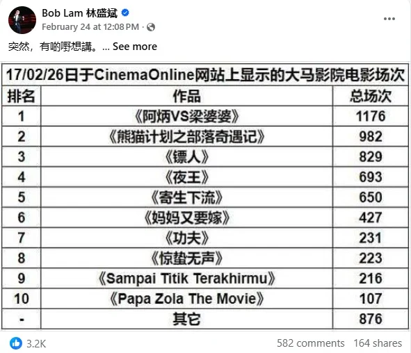 2026年大马贺岁档竞争愈演愈烈。林盛斌(Bob)日前在社交平台发文,贴出同期电影场次对比图,感慨自家作品排片不占优势,未料却疑似引来《阿炳VS梁婆婆》团队不满,被指“带风向”、“借刀杀人”,风波迅速发酵。