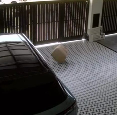 视频显示,送货员疑似按门铃未获回应后,站在屋外把一个正方形包裹抛入车房内。画面中,包裹落地时传出疑似物品碎裂的声响,送货员随后再按门铃,视频至此结束。