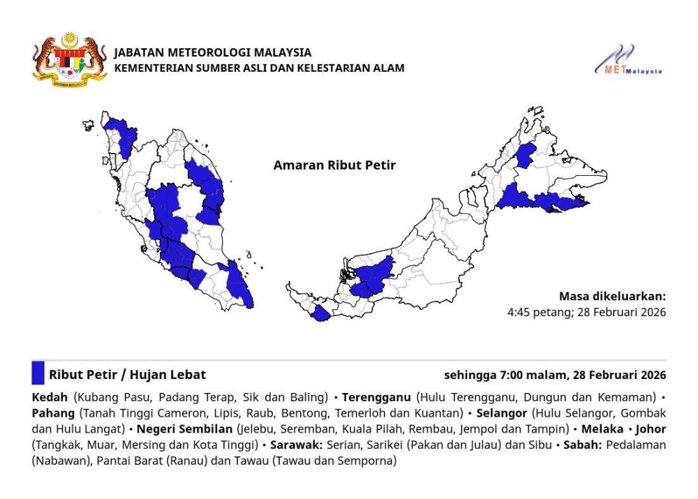 大马气象局于今日下午4时45分发布最新雷雨警报,预告半岛多个州属、砂拉越及沙巴部分地区将在即日起至傍晚7时,持续遭遇雷雨、强风及豪雨袭击。