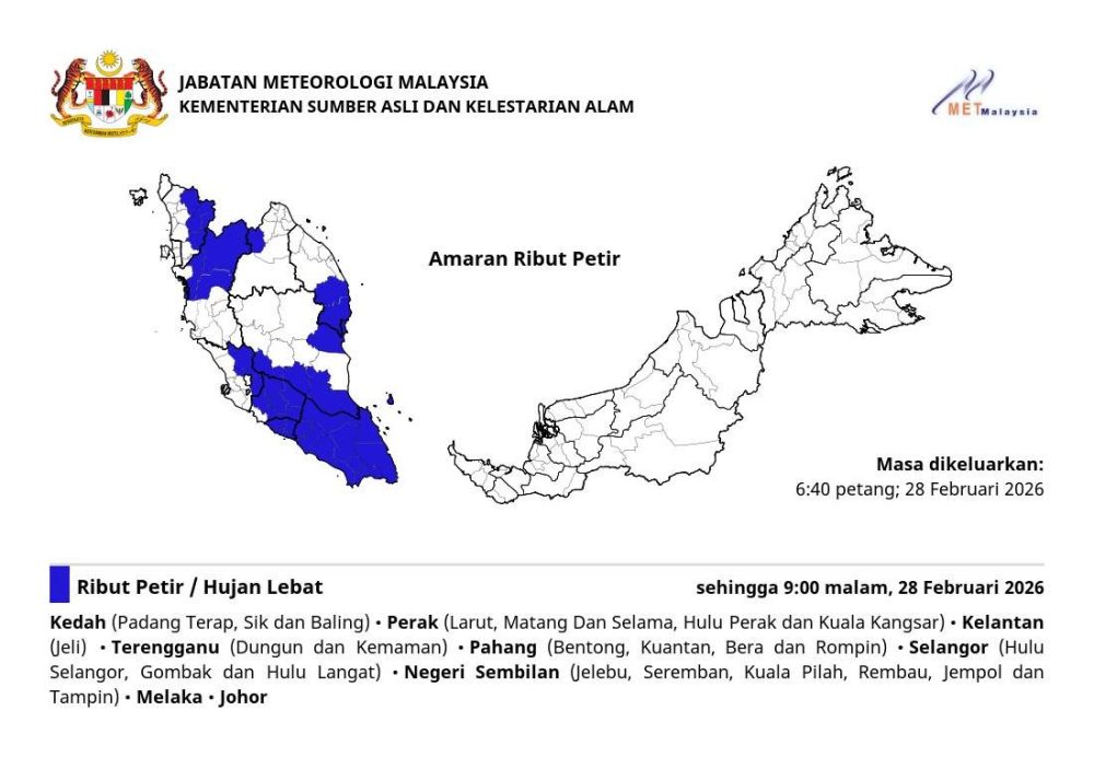 大马气象局于今日傍晚6时40分发布最新雷雨警报,预告半岛多个州属将在即日起至晚上9时,持续遭遇雷雨、强风及豪雨袭击。