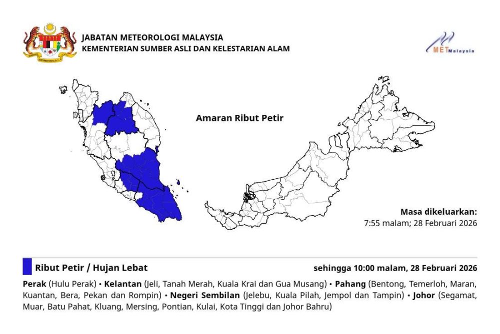 马来西亚气象局刚刚发布突发雷雨警报,霹雳、吉兰丹、彭亨、森美兰及柔佛多地预计将遭遇强雷雨、暴雨及狂风袭击,恶劣天气预计持续至今晚10时。民众受促在这段期间提高警惕,注意人身安全。