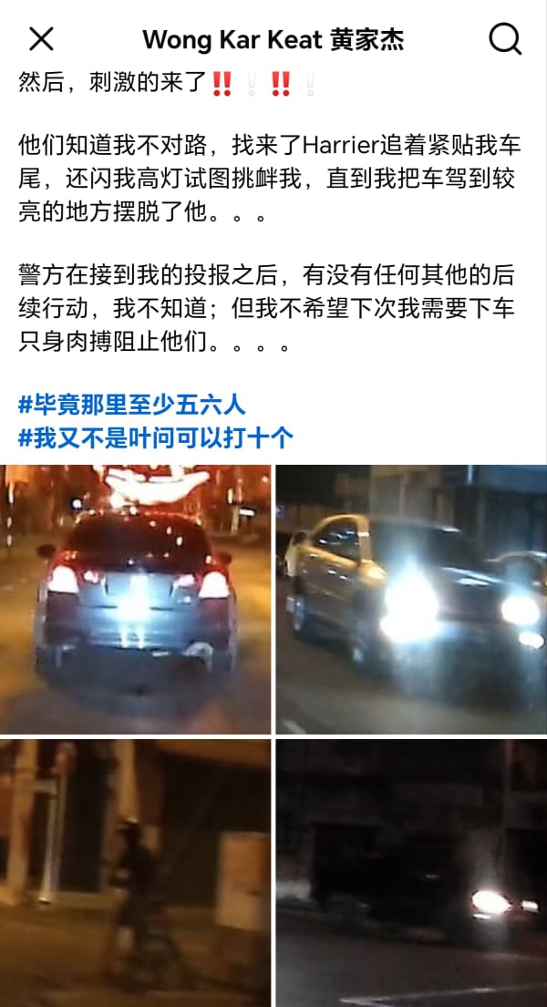 他在帖文中也表示,警方接获投报后是否有进一步行动,他并不清楚;但他不希望未来再遇到类似情况时,被迫下车与对方正面冲突以阻止对方干案。