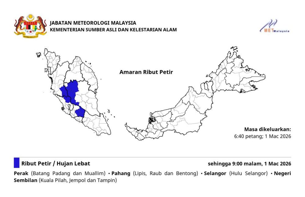 马来西亚气象局(MET Malaysia)今日(3月1日)傍晚发布最新天气预报,针对半岛多个地区发出雷雨警报,预计恶劣天气将持续至晚上9时。
