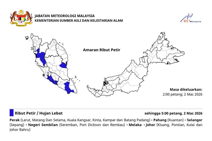 气象局发布最新闪电水灾与暴雨预警!从即刻起至今日(3月2日)下午5时,我国多个州区将迎来强烈雷阵雨及狂风大作,民众受促提高警惕。