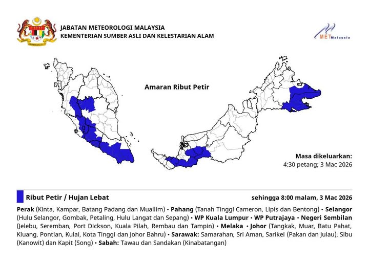 下班放学高峰期遇上恶劣天气!气象局再次升级雷雨预警,大马多个州属的暴雨强风天气将延长持续至至今晚(3日)8时,民众受促在路面上加倍小心。