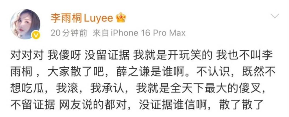 然而,就在全网坐等吃瓜之际,剧情竟出现低级反转——李雨桐在发文半小时后火速删文,并改口称“没有证据”、“只是开玩笑”,反覆无常的操作让大批大马网民傻眼,纷纷质疑其精神状态或纯属“冷饭热炒”博关注。
