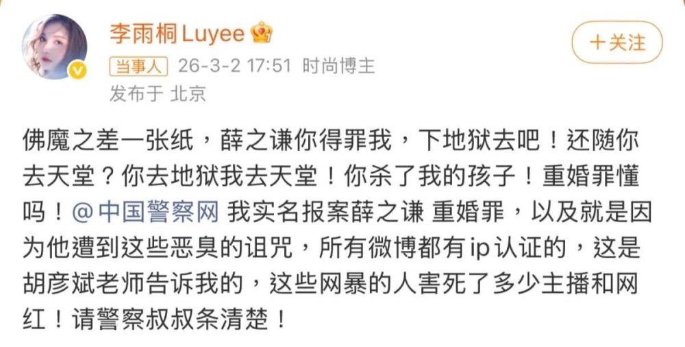 李雨桐早前在微博抛出多条重磅指控,实名检举薛之谦涉嫌重婚罪、威胁及仙人跳,甚至字字见血地控诉对方“杀了我的孩子”。她不仅怒呛薛之谦与妻子设局骗财骗色,更摆出“君子报仇,十年不晚”的姿态,扬言要将对方的“丑恶嘴脸”公之于众。