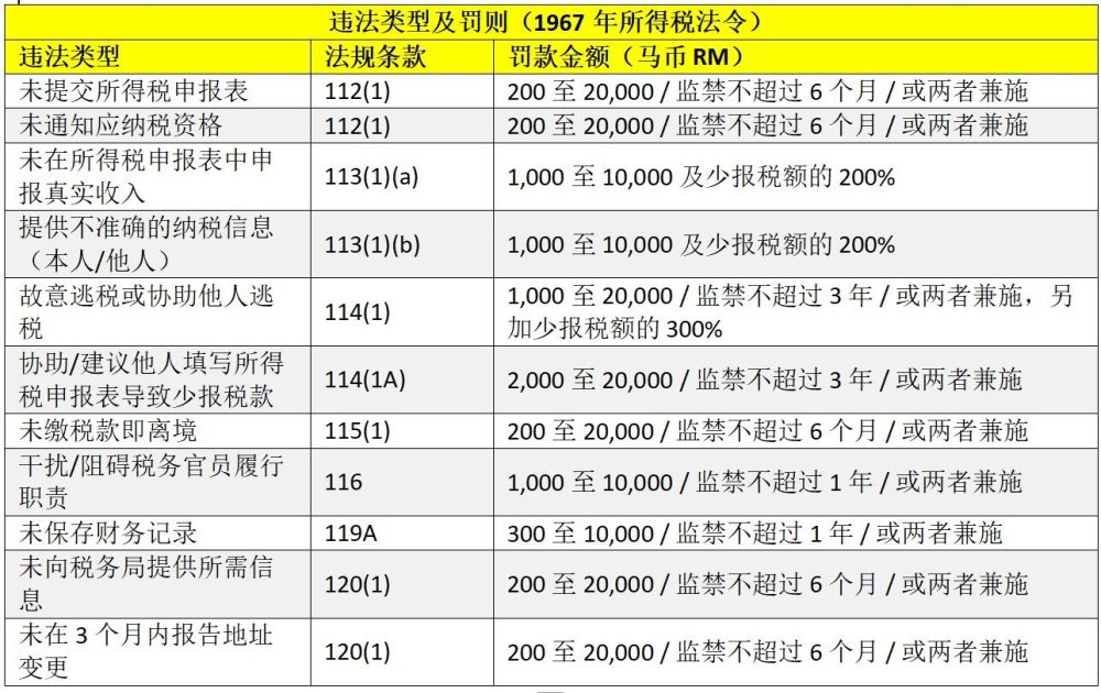 根据马来西亚1967年《所得税法令》,多项税务违规行为都可能面临严厉处罚。若纳税人未按规定提交所得税申报表,或未向税务局申报已达到纳税条件,可能被罚款200令吉至2万令吉,并可能面临最长6个月监禁。