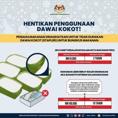 吉隆坡与布城卫生局此前也曾在社交平台发文提醒食品业者,必须立即停止在食品或糕点包装中使用订书钉。根据食品安全法规,违规商家若被查获,可面临最高1万令吉罚款或最长2年监禁;若涉及将危险物品直接用于食品包装,罚款可提高至10万令吉,并可能面临最高10年监禁。