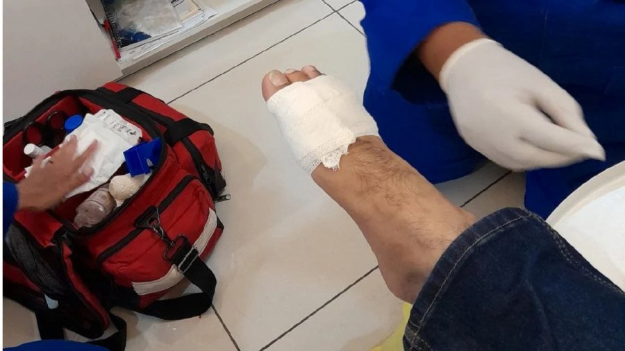他指出,救援人员赶抵现场后,发现伤者脚部被钉子刺中,导致明显伤势。