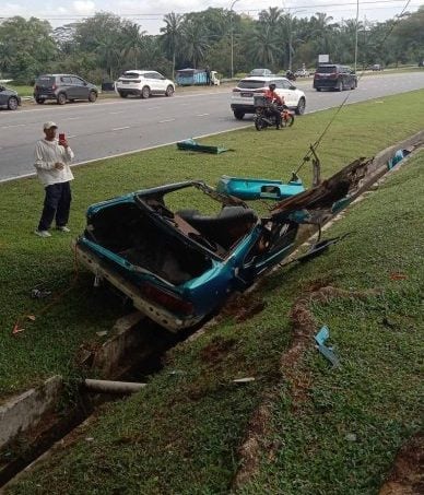这起意外于昨日下午3时45分,在亚依淡路朝士姑来方向行驶的路段、约18公里处发生。社交媒体随后流传现场照片,可见涉事车辆损毁程度惊人,车头与车身结构明显断裂,残骸散落在路肩与草地一带。